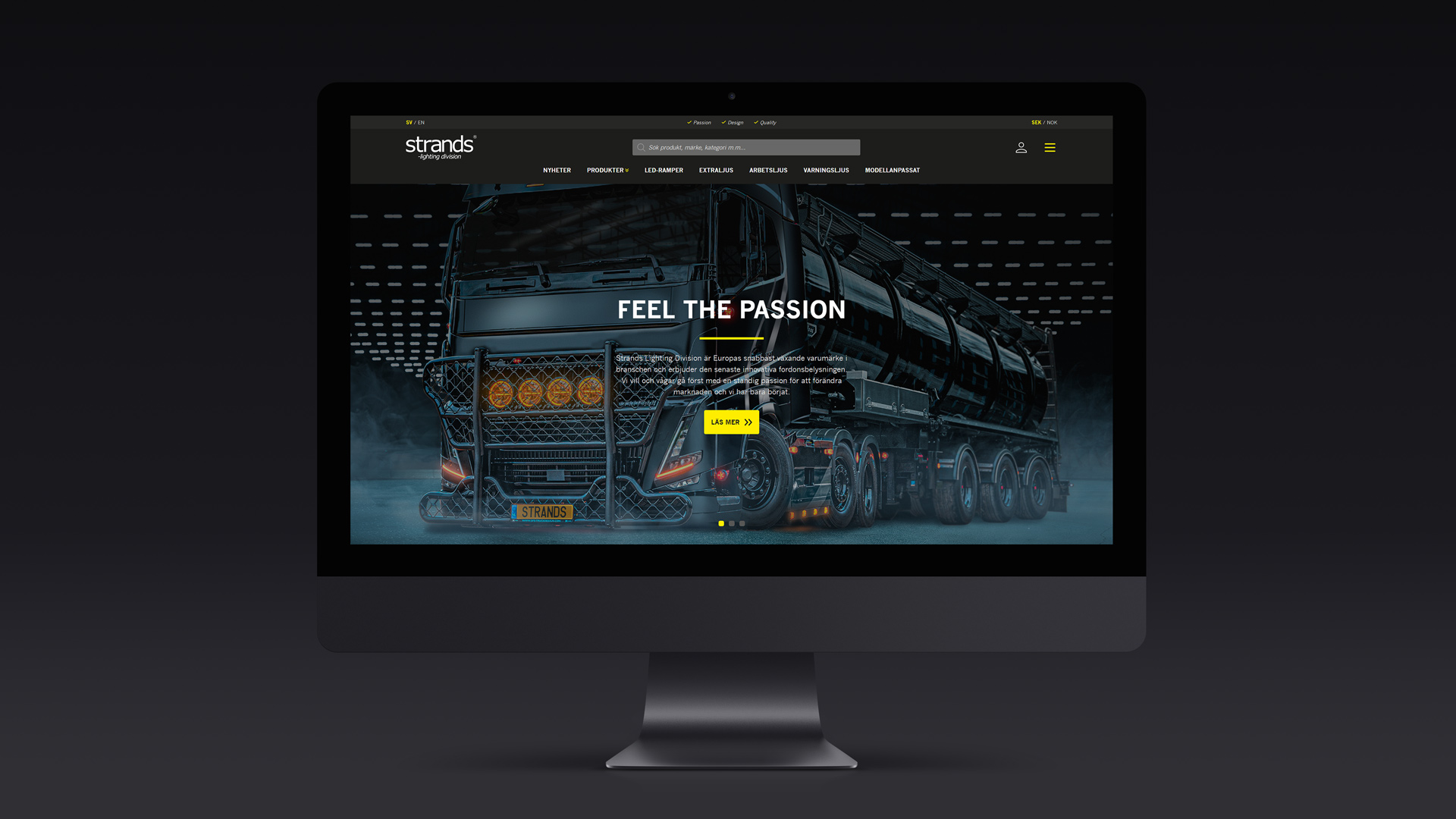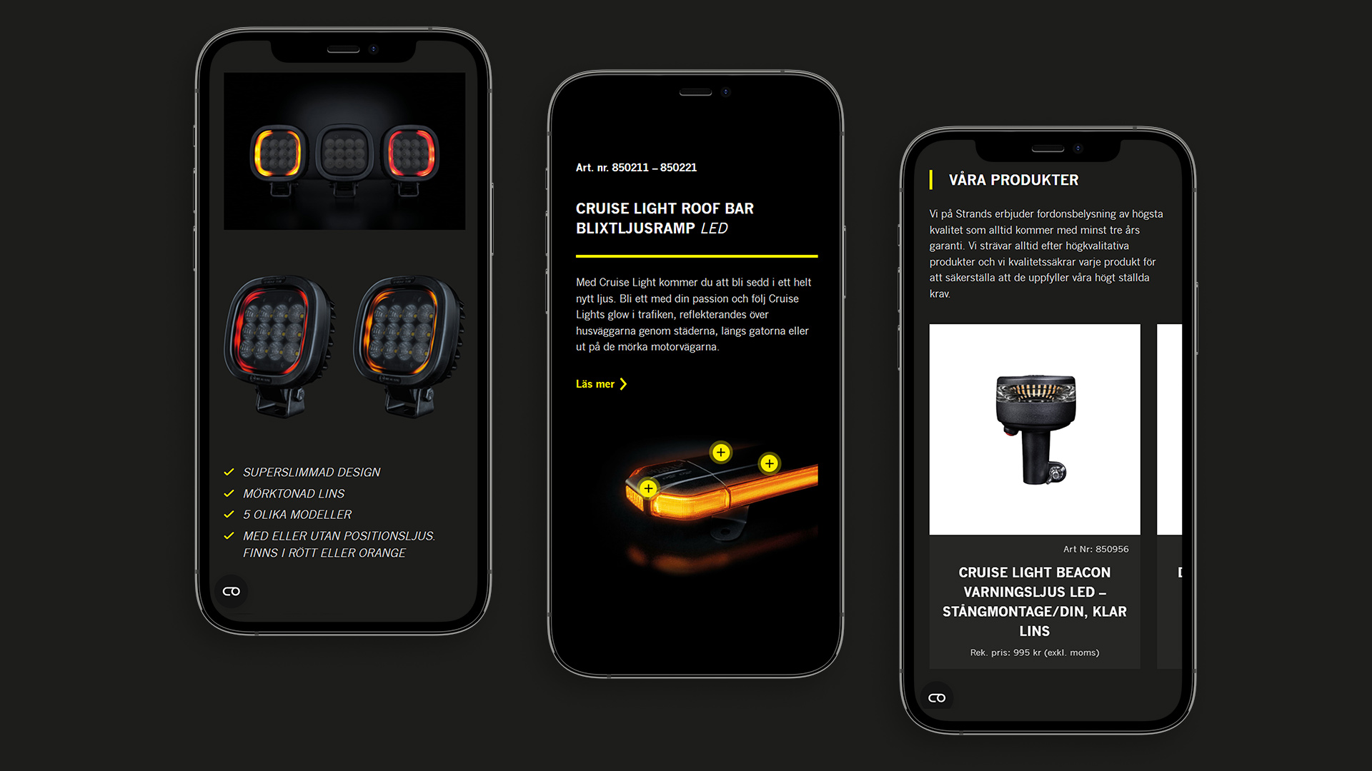 Arbetet började med att vi översatte Strands befintliga uttryck till en fungerande webbdesign. Genom att använda en mörk grund skapade vi en kontrast till bildernas färgstarka innehåll, något som förstärker fokuset på vad Strands gör bäst, nämligen belysning,
